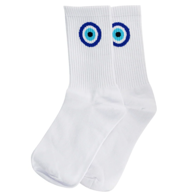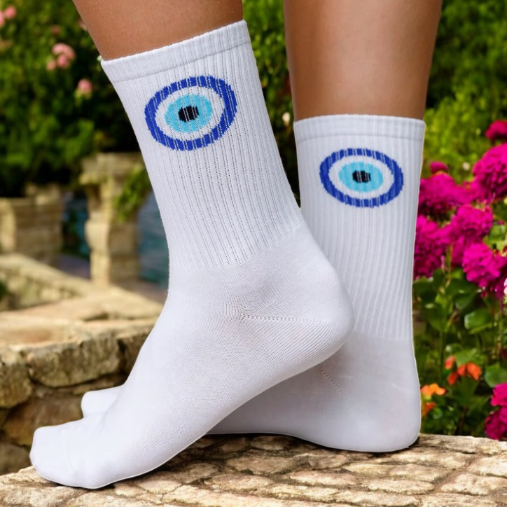 Ward off bad vibes in style with these women's evil eye socks! Featuring a minimalist white crew design with a bold blue evil eye motif, they add a touch of protection and charm to any outfit. Perfect for casual wear, spiritual gifts, and unique sock lovers. Soft, breathable, and made for all-day comfort!