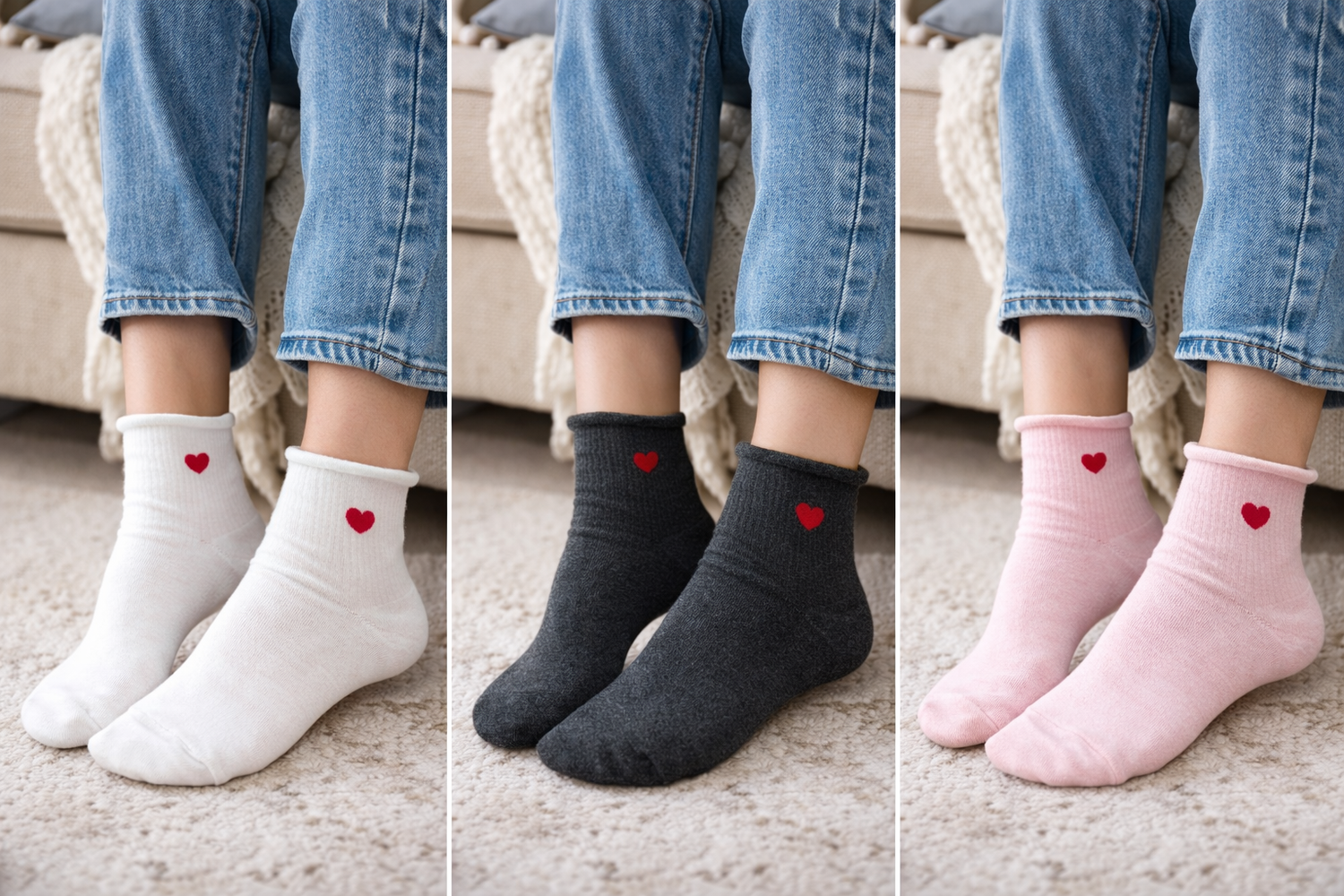 Minimal heart, maximum vibe. Lightweight, soft ribbed ankle socks with a rolled cuff and a embroidered red heart detail. Everyday comfort with a subtle Valentine touch. Available in white, charcoal, and blush pink.