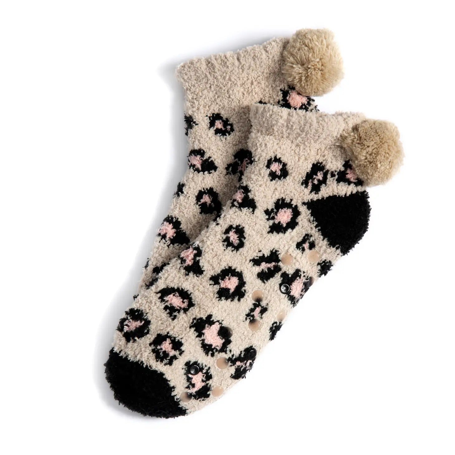 Womens Pom Pom Socks with Grippers - Leopard Print Taupe Black Pink
