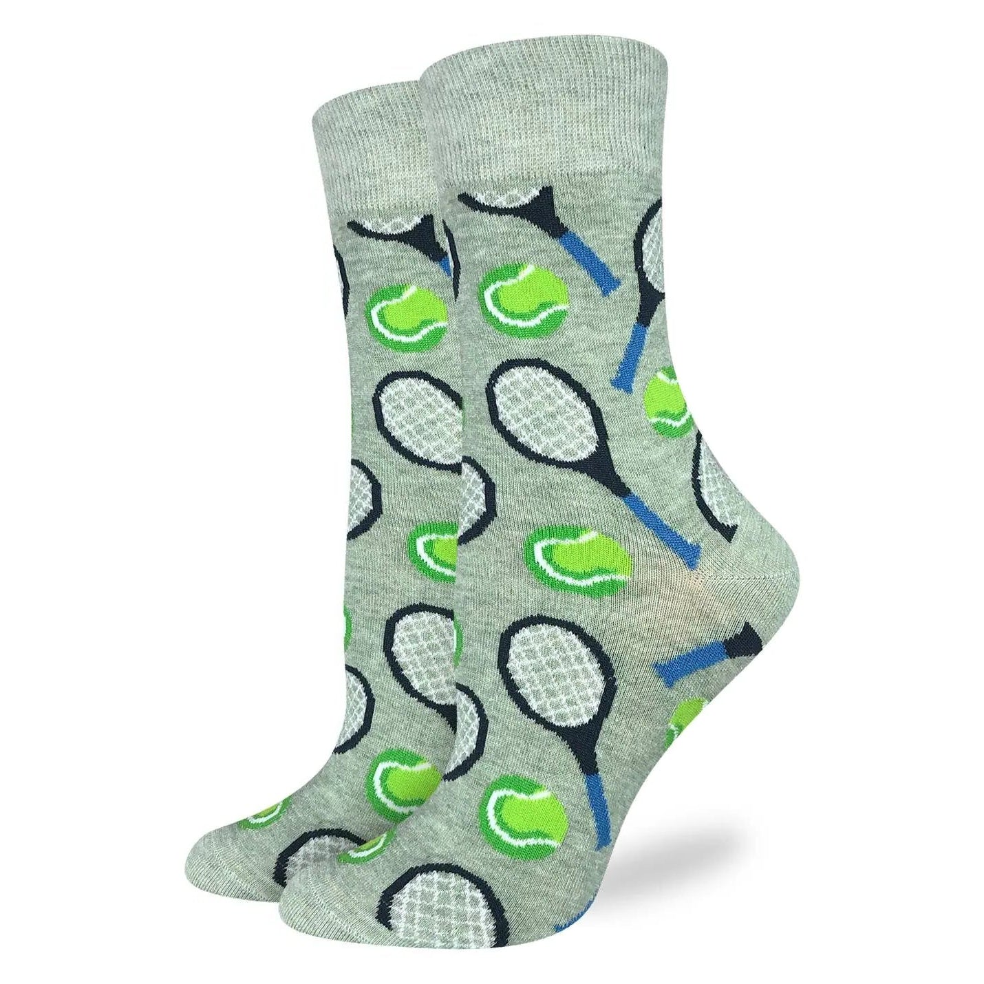 Women’s tennis socks with green tennis balls and rackets on gray background; perfect for tennis players, tennis lovers, athletes, and fans. Fun novelty crew socks for women who play tennis or love the sport. Great tennis gift for her—soft, comfortable, and sporty style.